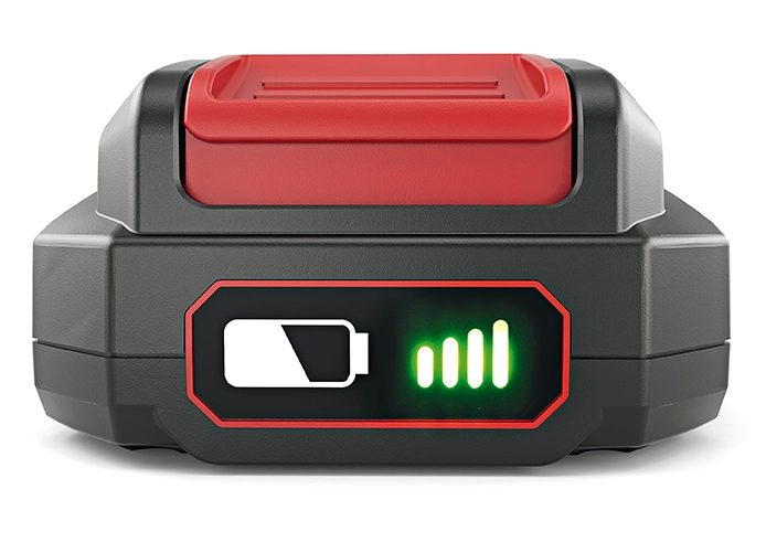 - Pack accu Li-Ion 18,0 V avec protection de déchargement integrée, indicateur d’état de chargement, protégé contre poussière et eau.