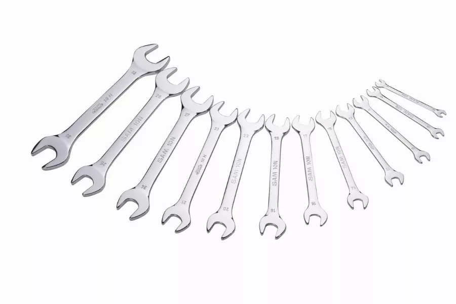 Jeu de 12 clés à fourches forgées en acier au chrome vanadium.
