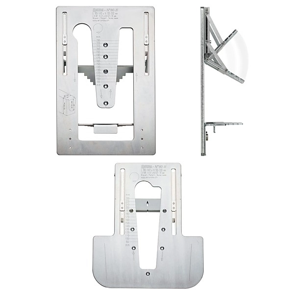 - Ces gabarits sont équipés de butées coulissantes et inclinables à +50°/90°/–50°. Ils servent à réaliser tous les assemblages qu’ils soient ordinaires ou compliqués. La réalisation d’assemblages en biais s’en trouve ainsi facilitée notamment dans le cas de chevron contre chevron et chevron sur panne faîtière délardée. Les butées coulissantes peuvent être positionnées en continu chaque mm et s’incliner graduellement. Les gabarits à butées inclinables disposent d’une graduation double en millimètres (mm) et en pouces (« /in/inches).