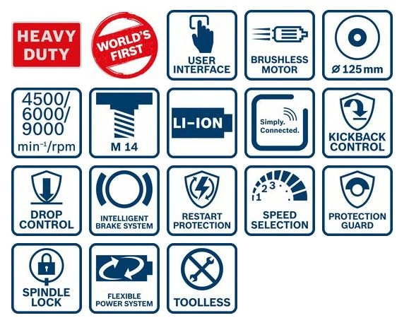- La meuleuse est dotée des fonctions Drop Control, KickBack Control et d’un système de freinage intelligent pour un maximum de confort et une protection optimale de l’utilisateur. Son module Bluetooth Connectivity permet d’effectuer des réglages directement via l’application Toolbox et son interface utilisateur avec présélection de vitesse permet d’obtenir des informations d’état détaillées sur l’outil pour un confort maximal.