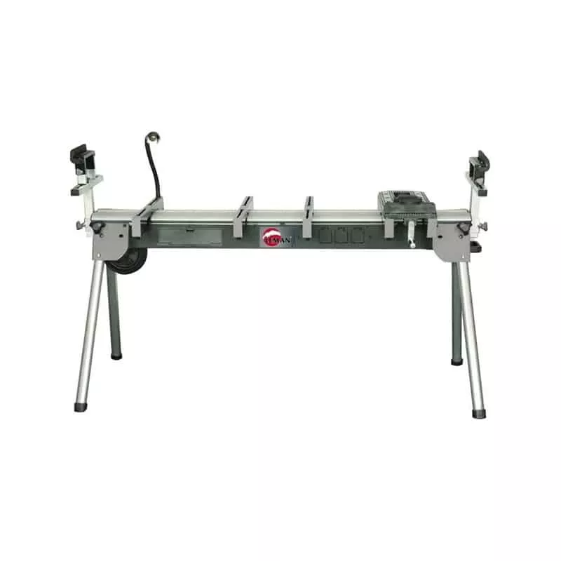- Bras télescopique gradué, équipé d’une servante à rouleau réglable en hauteur, avec possibilité de relever une butée pour le travail en série.